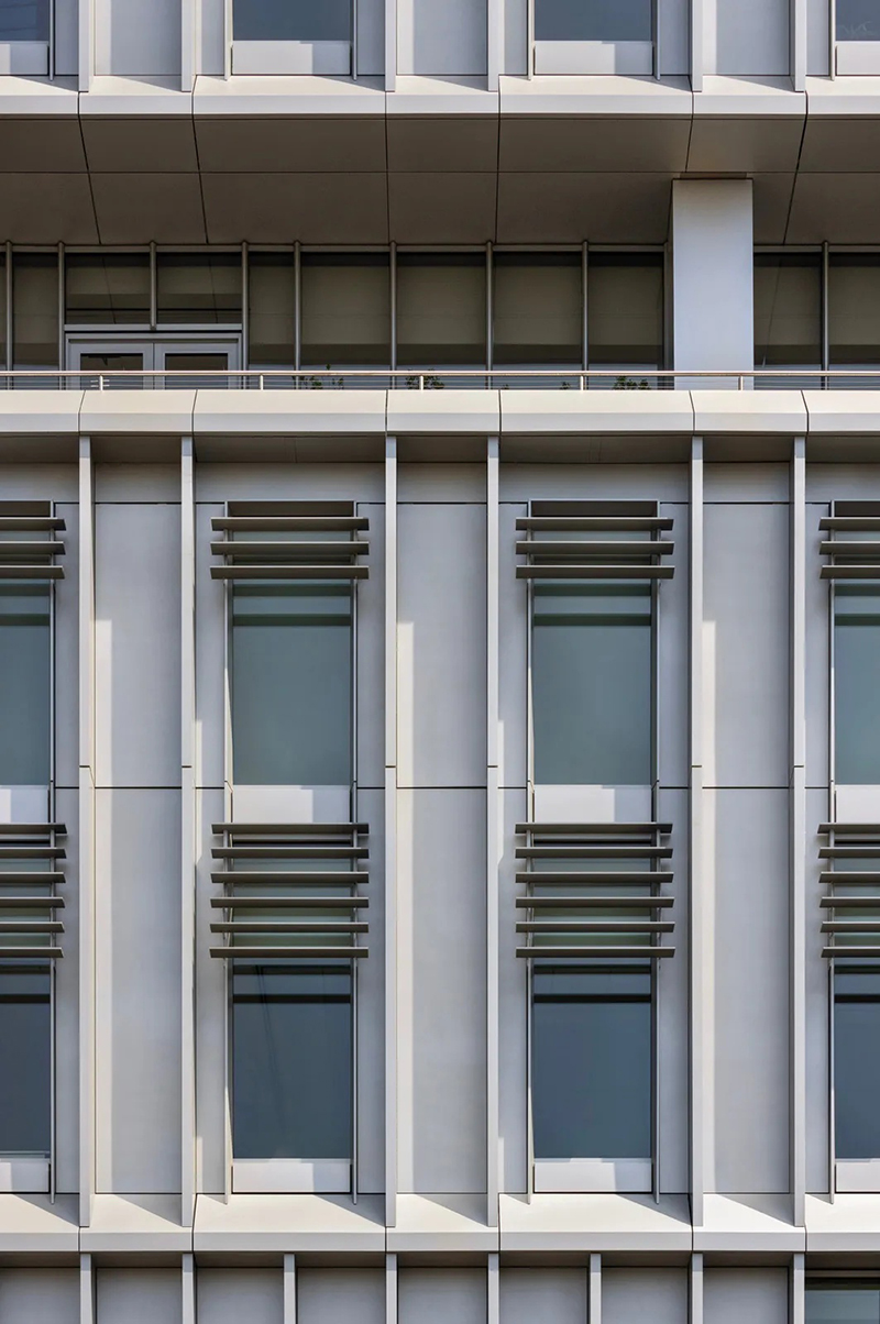 作為國會大廈校區(qū)的旗艦建筑,麥考特學校是喬治城市中心文脈和連貫性的延伸。125 E St.是一座由石材、鑲板金屬和玻璃幕墻組成的立方體建筑,其外形和規(guī)模與周邊建筑一脈相承。垂直鰭片和磚砌底板--主要用于遮擋陽光并優(yōu)化熱性能--用凸出的線條勾勒出建筑的立面,與鄰近的西北第一街 500 號的統(tǒng)一沖孔窗戶遙相呼應(yīng)。然而,麥考特學院的 125 E St. 建筑則通過金屬、石材和玻璃的交錯使用,引入了新的視覺趣味。