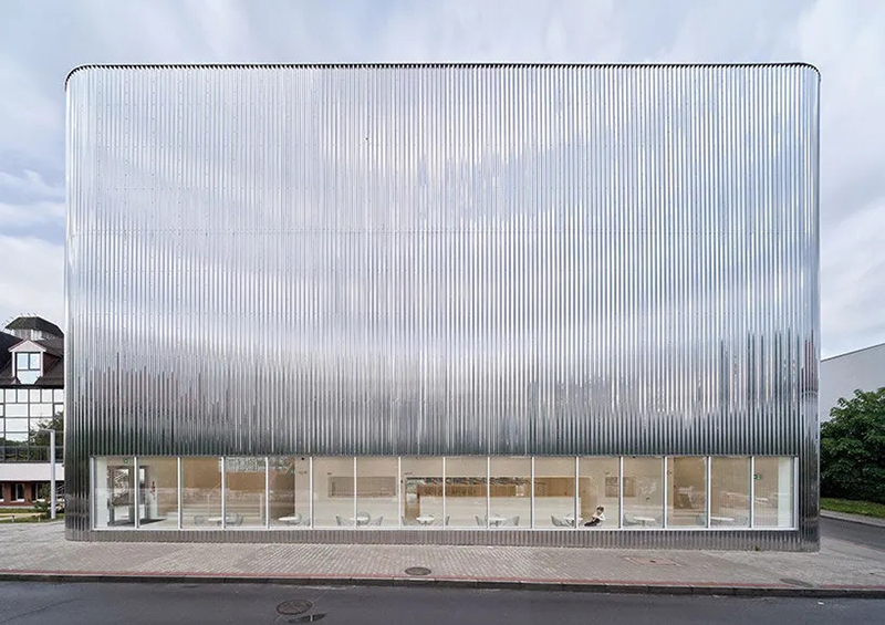 SLAS Architekci 選擇混凝土作為音樂廳結構、聲學和美學屬性的主要材料。通過讓鋼筋混凝土墻暴露在外,并以釉面漆進行裝飾,從而無需額外的聲學覆層。音樂廳內部采用聲學優(yōu)化的波浪圖案,這一設計元素也延伸至鋼制外觀上。這不僅增強了聲音的擴散,還在建筑的內外之間創(chuàng)造了視覺連續(xù)性。鋼制外觀的反射特性有助于建筑與周圍環(huán)境的融合,而其耐久性則確保了建筑能夠抵御破壞和時間的考驗。